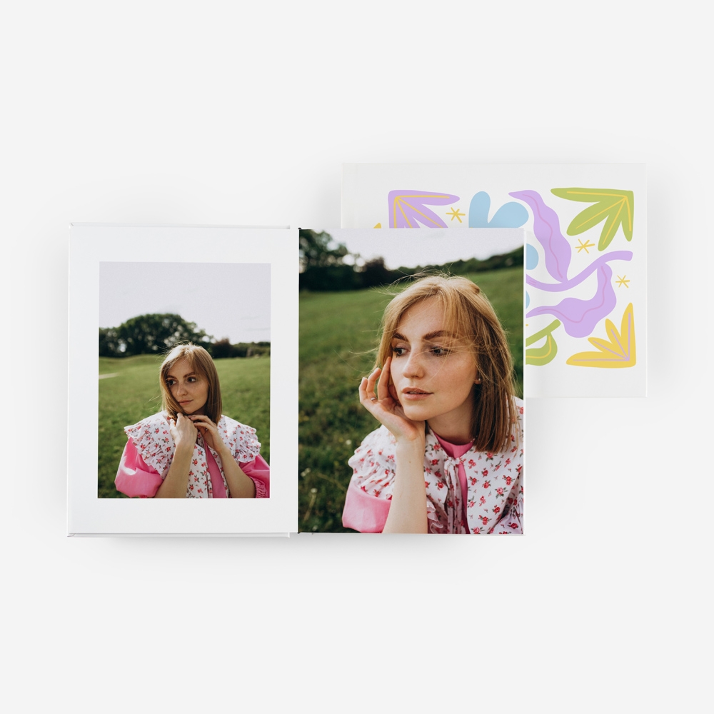 A capa rígida em cartão duro oferece proteção adicional e um acabamento elegante ao teu álbum.