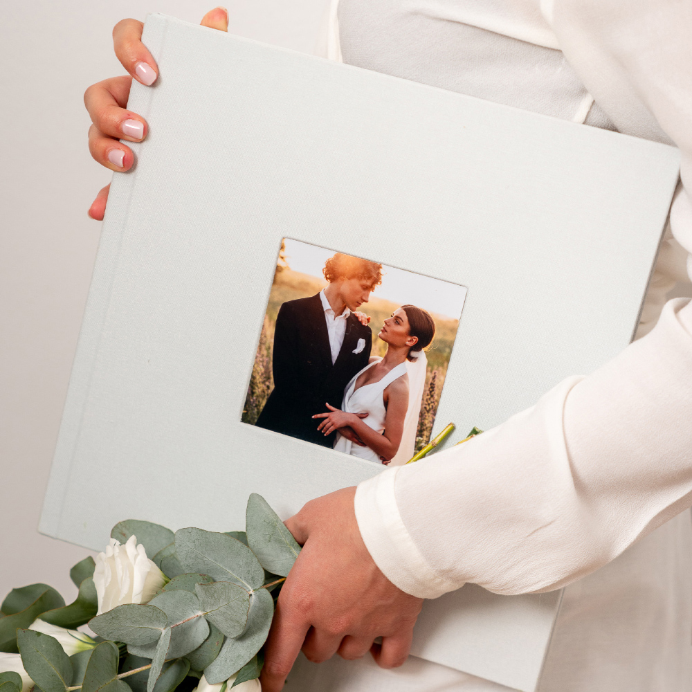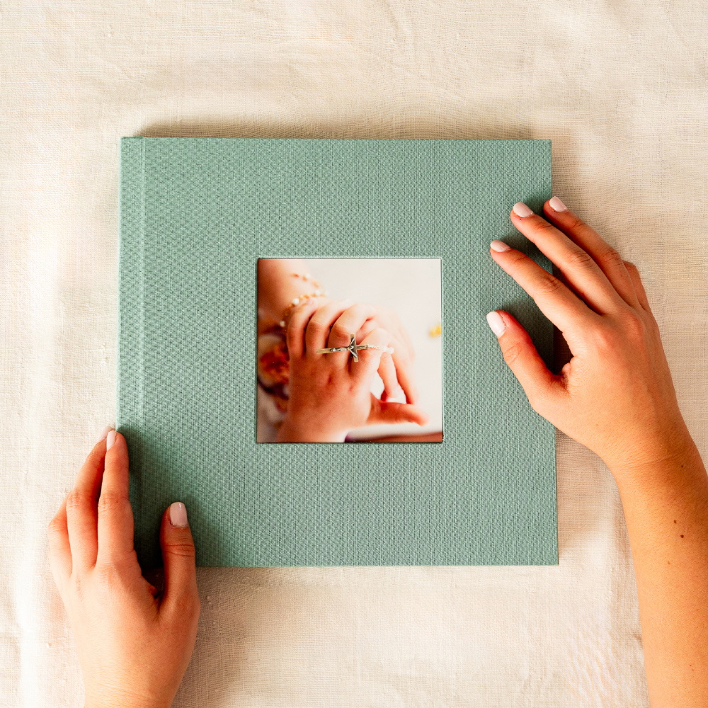 A janela do modelo Cameo é mais do que um detalhe, é uma declaração. A fotografia de 11 x 11 cm é impressa e cuidadosamente embutida na capa, fazendo parte da sua estrutura. Não é um encaixe para troca, mas sim a peça central e permanente do design do álbum. O tamanho da janela é o mesmo em todos os formatos, garantindo sempre o protagonismo da imagem.