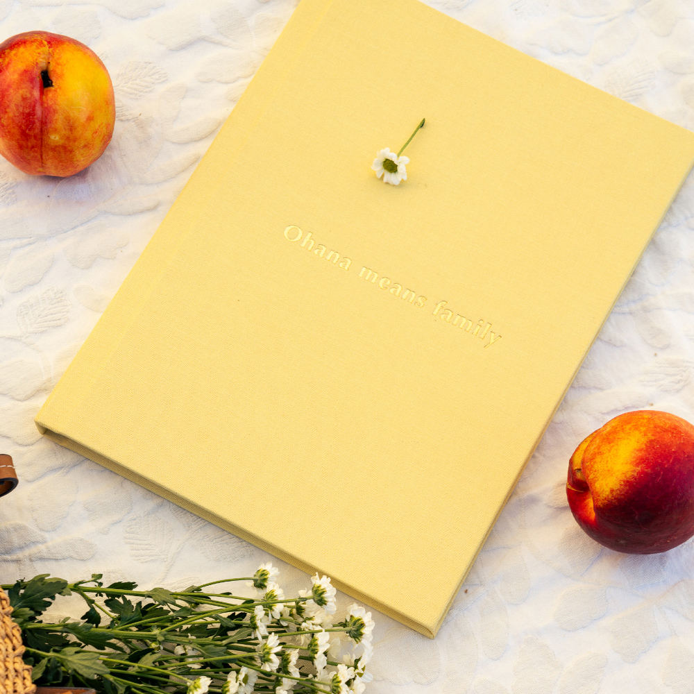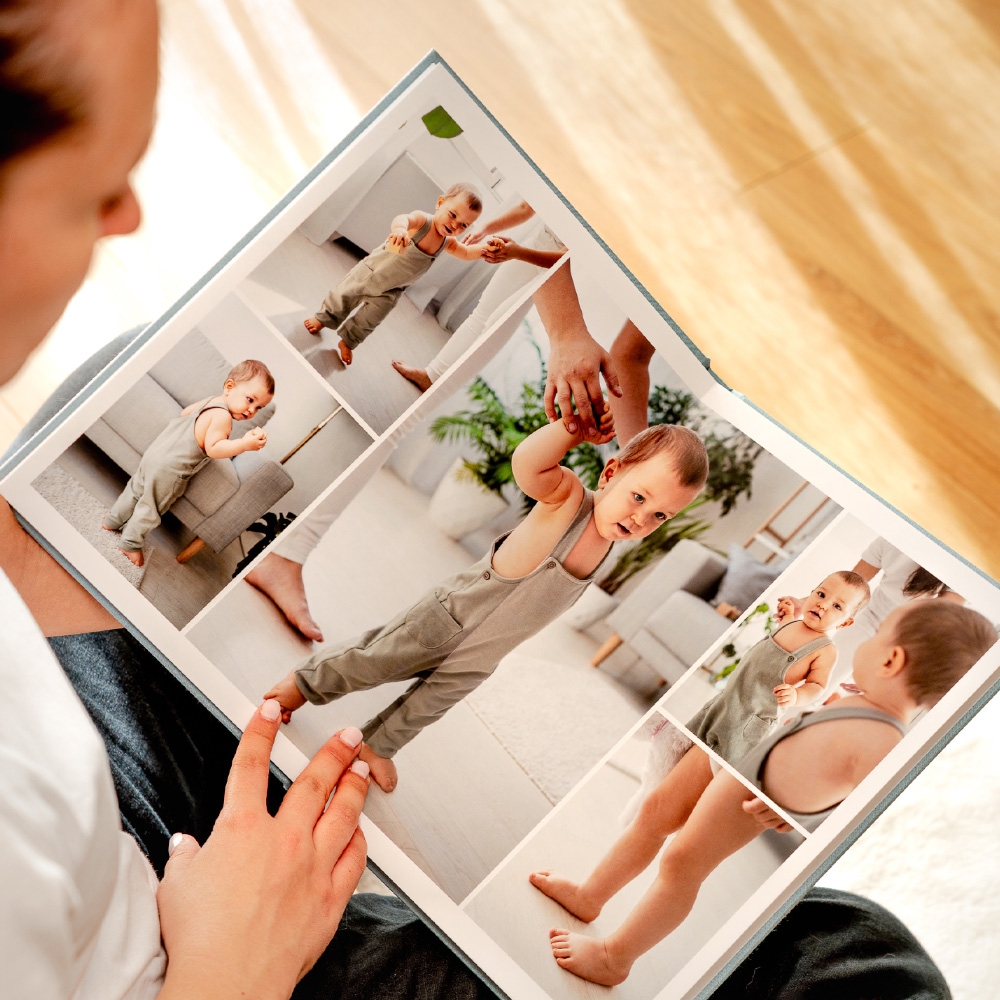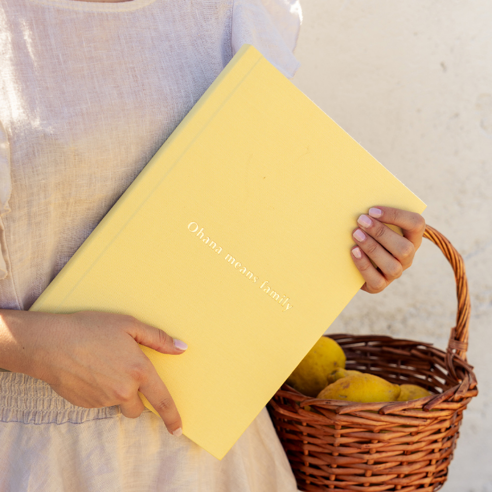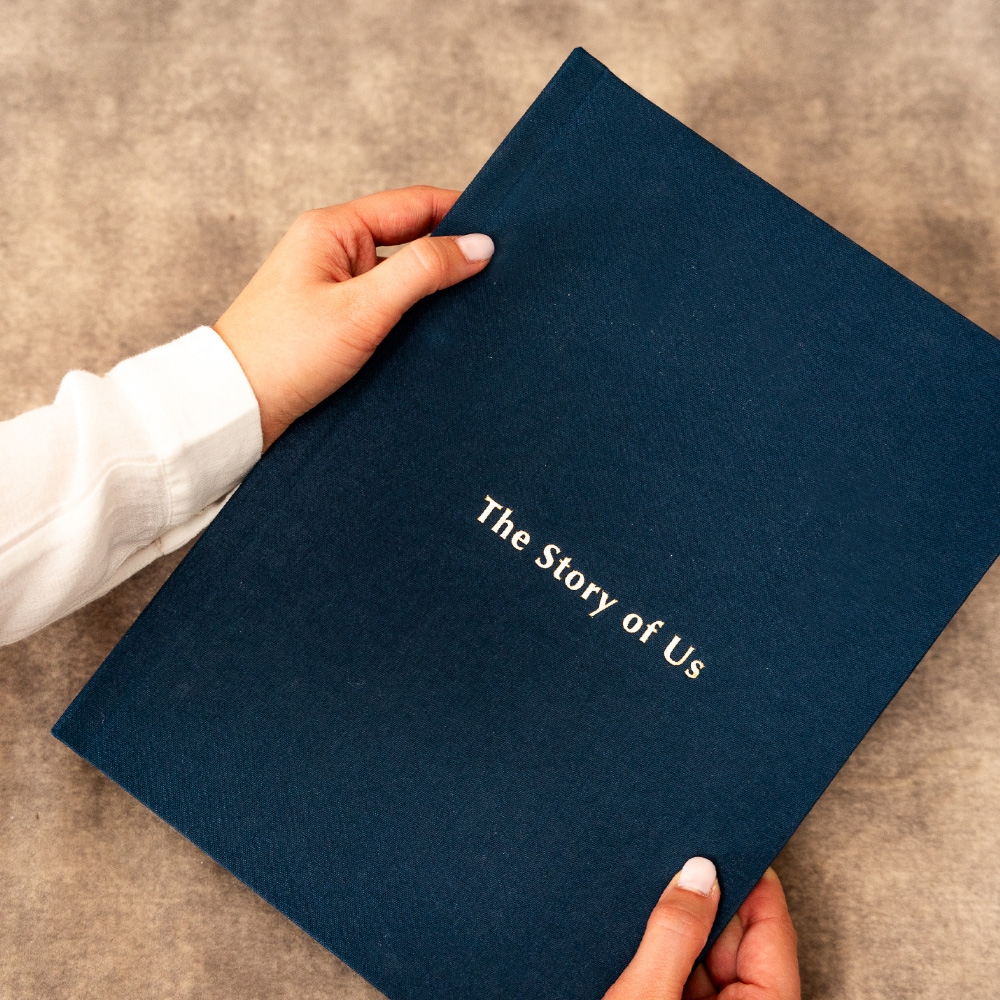 No modelo Inscription, a capa ganha uma assinatura própria. A técnica de stamping grava nomes, datas ou pequenas frases diretamente no tecido, criando um relevo subtil e elegante que transforma o álbum num objeto ainda mais ligado à história que guarda.