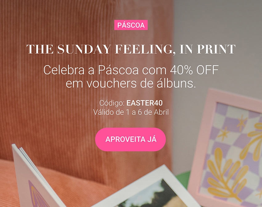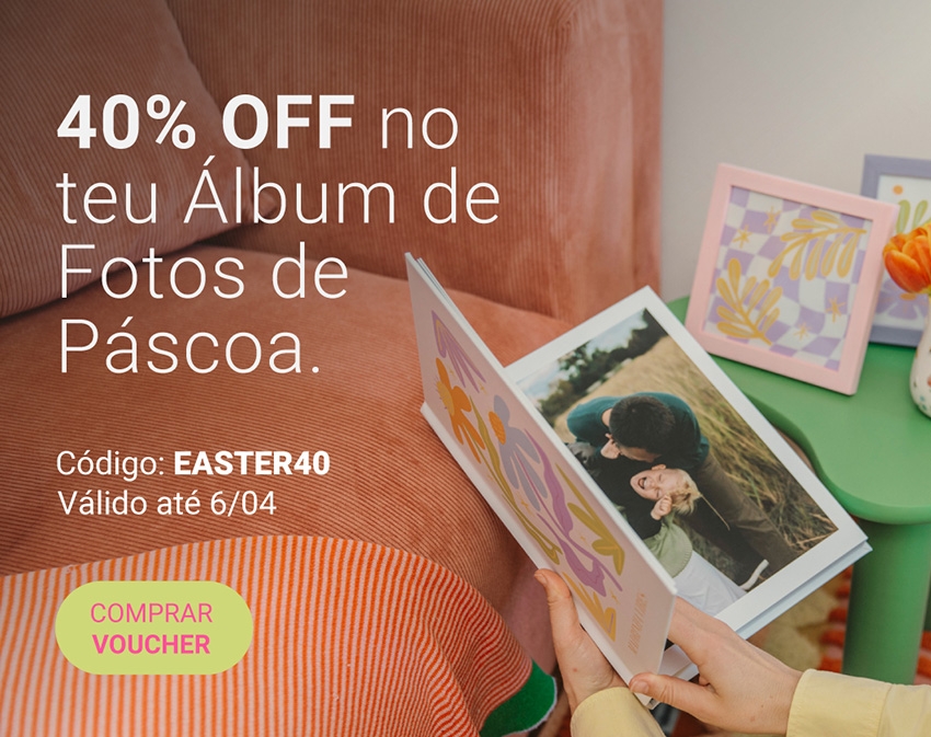 Garante 40% off no teu Álbum de Fotos de Páscoa. Código: EASTER40 . Válido de 1 a 6 de Abril.